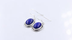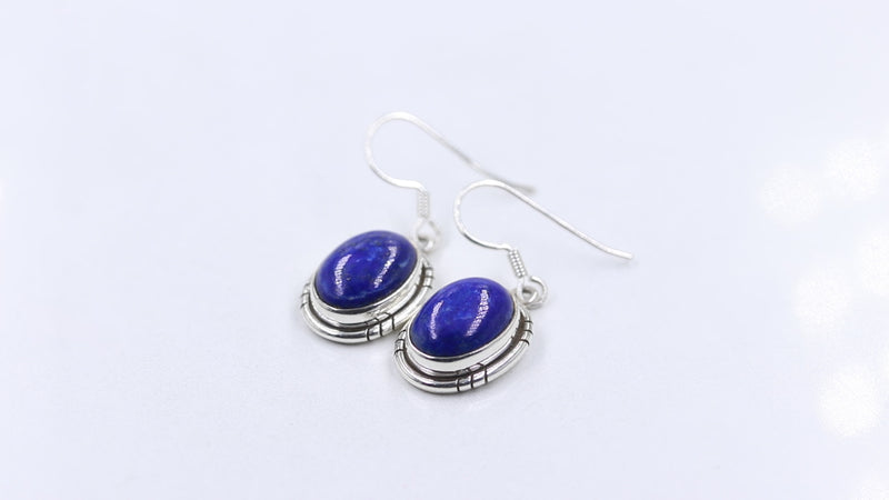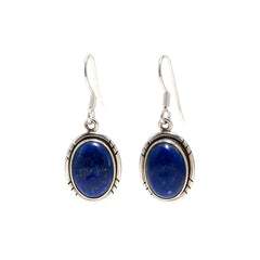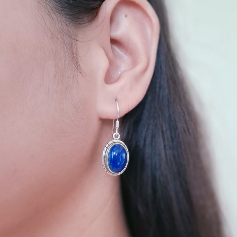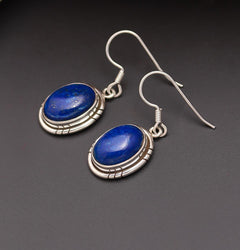 These elegant cabochon drop earrings in Lapis lazuli make a striking statement.The handcrafted silver frame encircles the lapis cabochon,making it stand out beautifully. 92.5 sterling silver stamp on each piece gives the product a stamp of quality.
