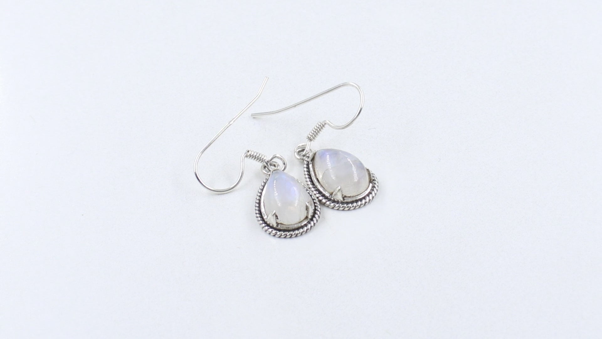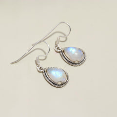 Elevate your outfit with these Moonstone dangle earrings. The beautiful pear shaped white moonstone in an eclectic silver frame on a fish hook can go from day to night. 92.5 sterling silver stamp on each piece gives the product a stamp of quality.