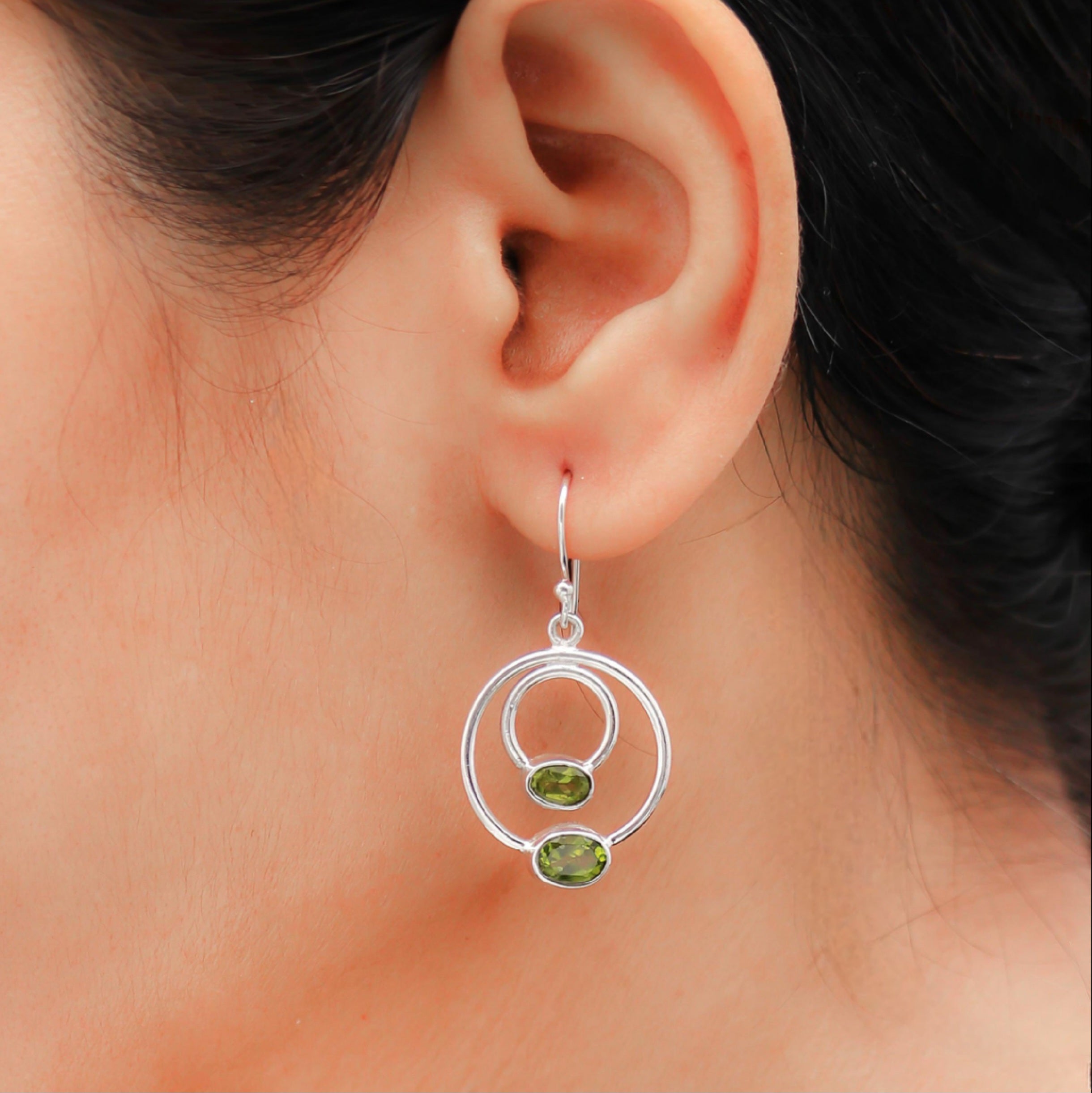 Eclectic Peridot duo Earrings with double loop create a delightful and graceful look. These Peridot Silver dangle earrings pair well with casual to formal occasions.92.5 sterling silver stamp on each piece gives the product a stamp of quality.