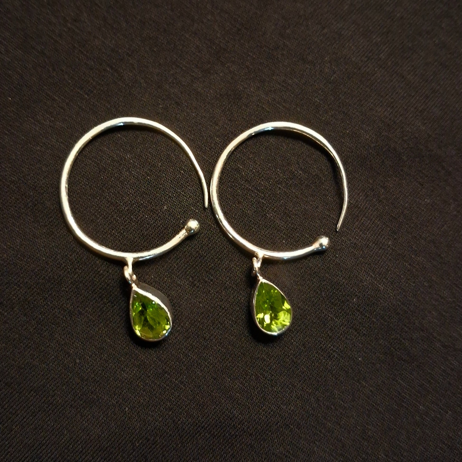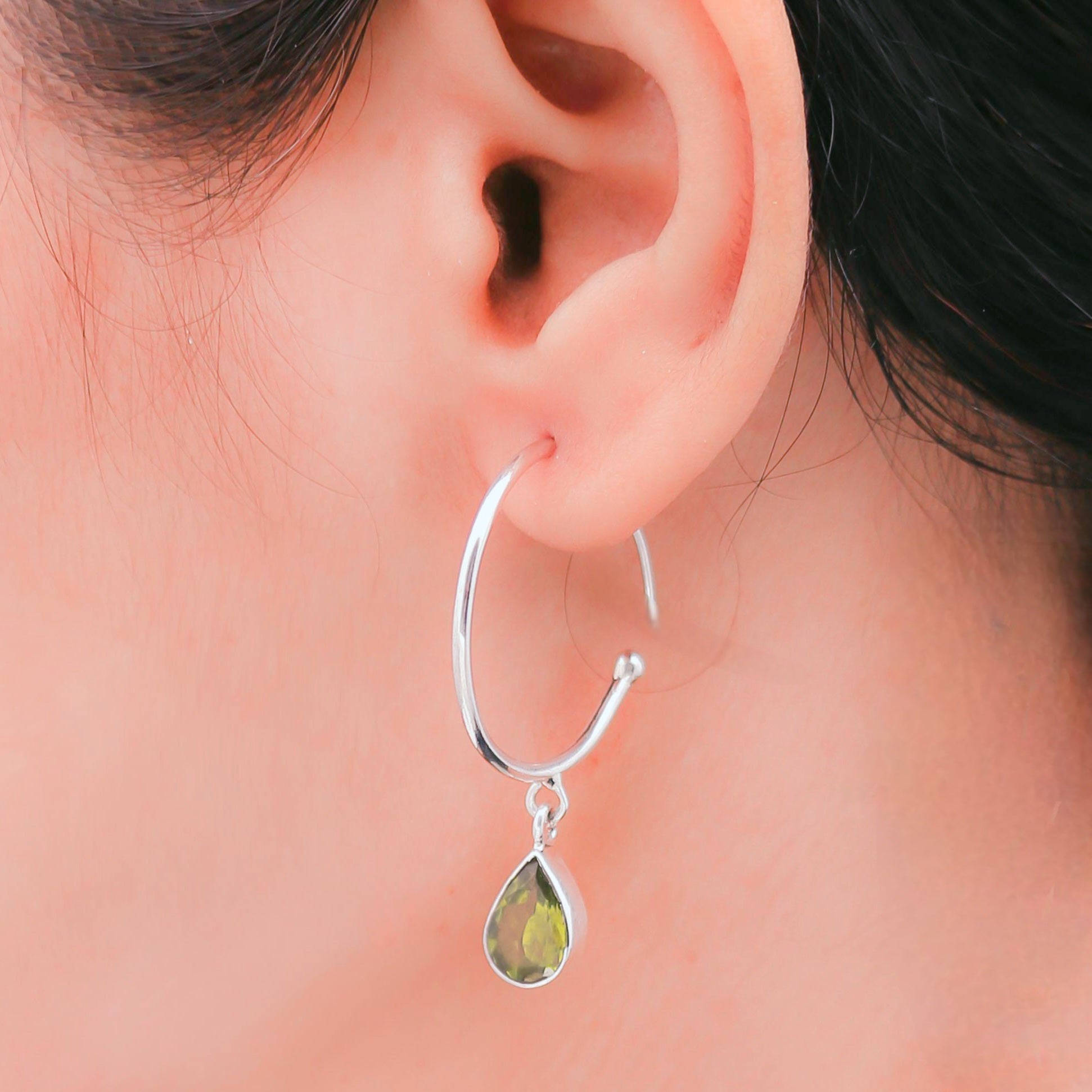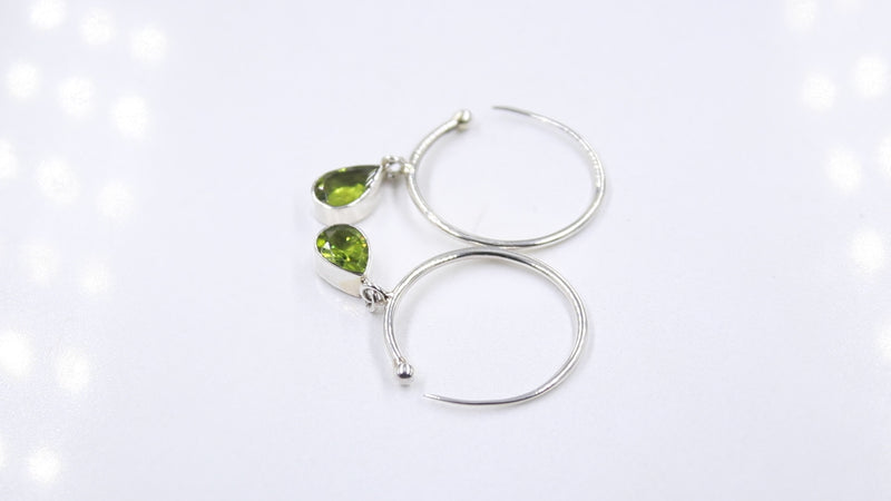 These Silver Open Hoop Earrings make a bold and elegant statement. They feature a drop shaped peridot at the bottom of each earring. They can be worn for any occasion to elevate your style.92.5 sterling silver stamp on each piece gives the product a stamp of quality.